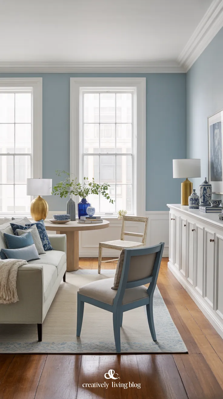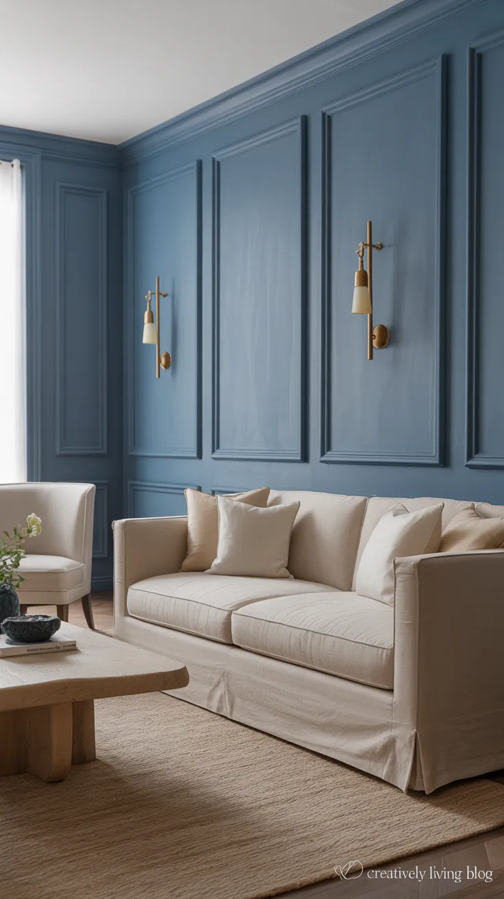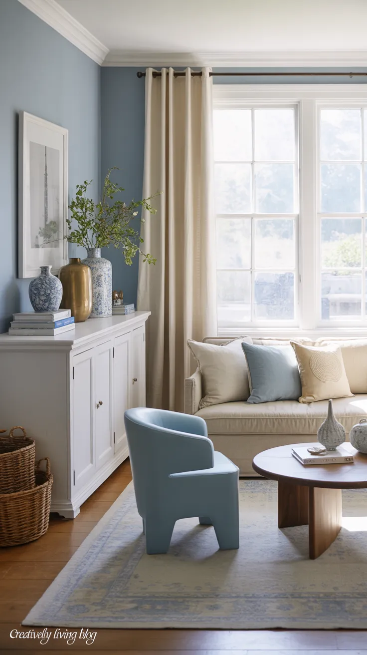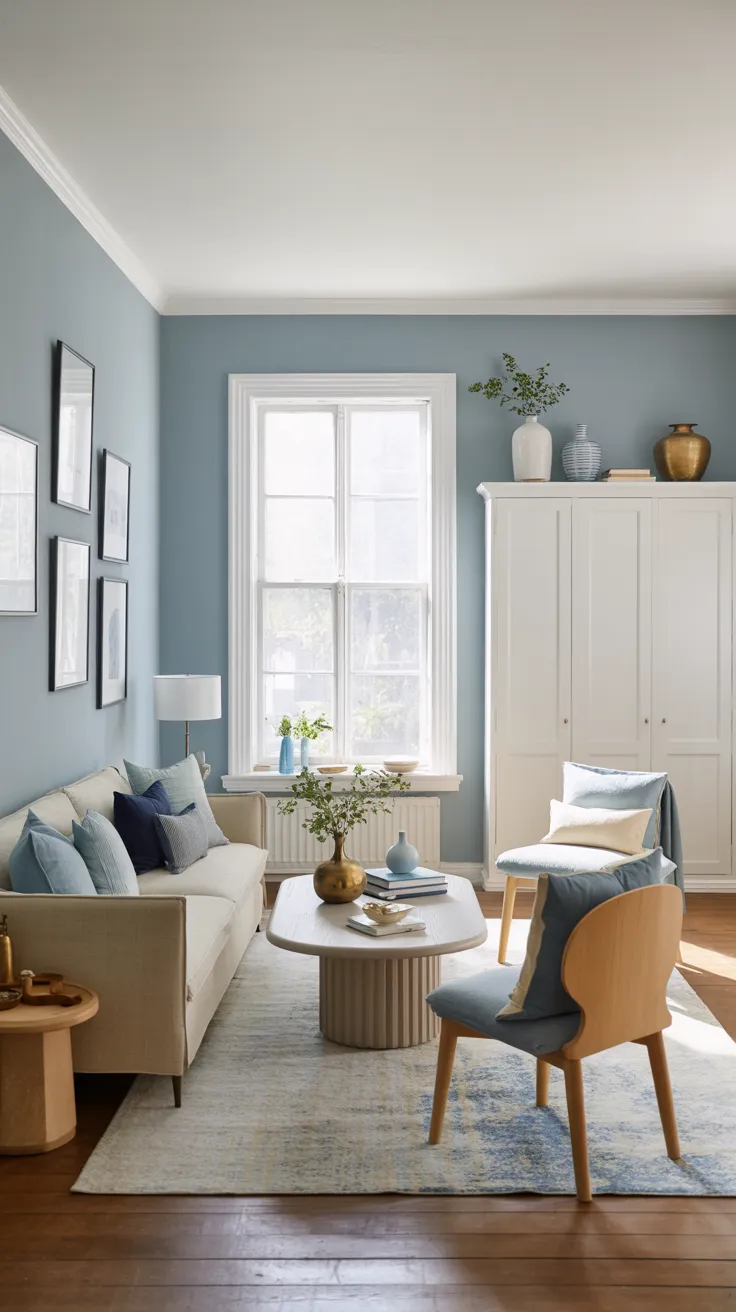 A dusty blue or muted slate blue wall behind the sofa gives the room personality without making it feel dark. Soft blues feel calming and airy, which is exactly what most living rooms need.