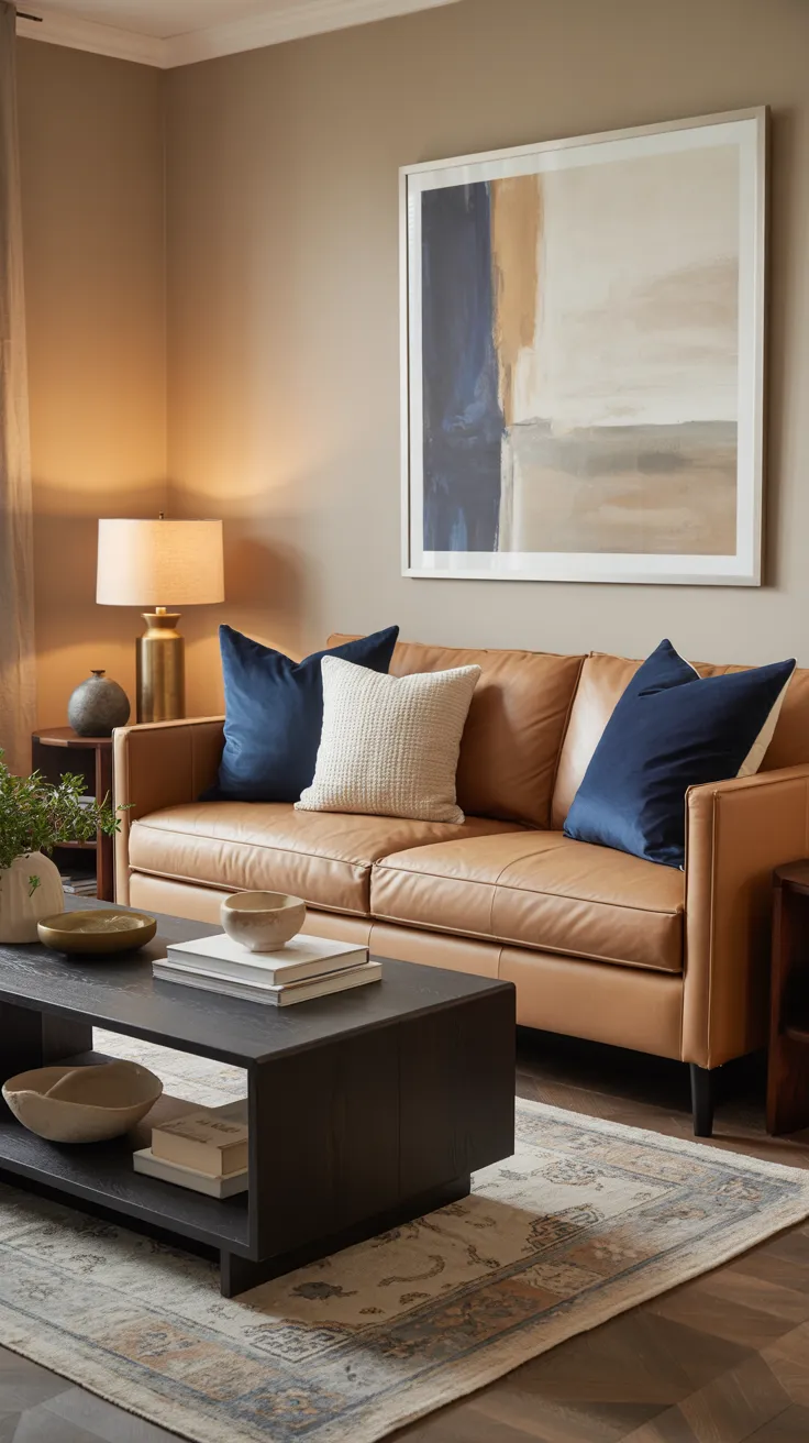 A camel-beige leather sofa paired with navy pillows, blue artwork, and dark wood furniture creates a rich, cozy look without feeling too heavy.