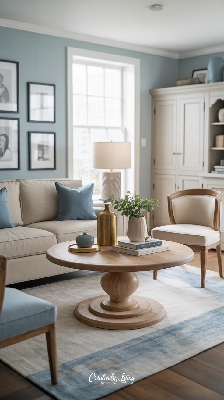 A pale blue rug under beige seating can soften the entire room. It adds color without a huge commitment and helps define the seating area, especially in open-concept spaces.