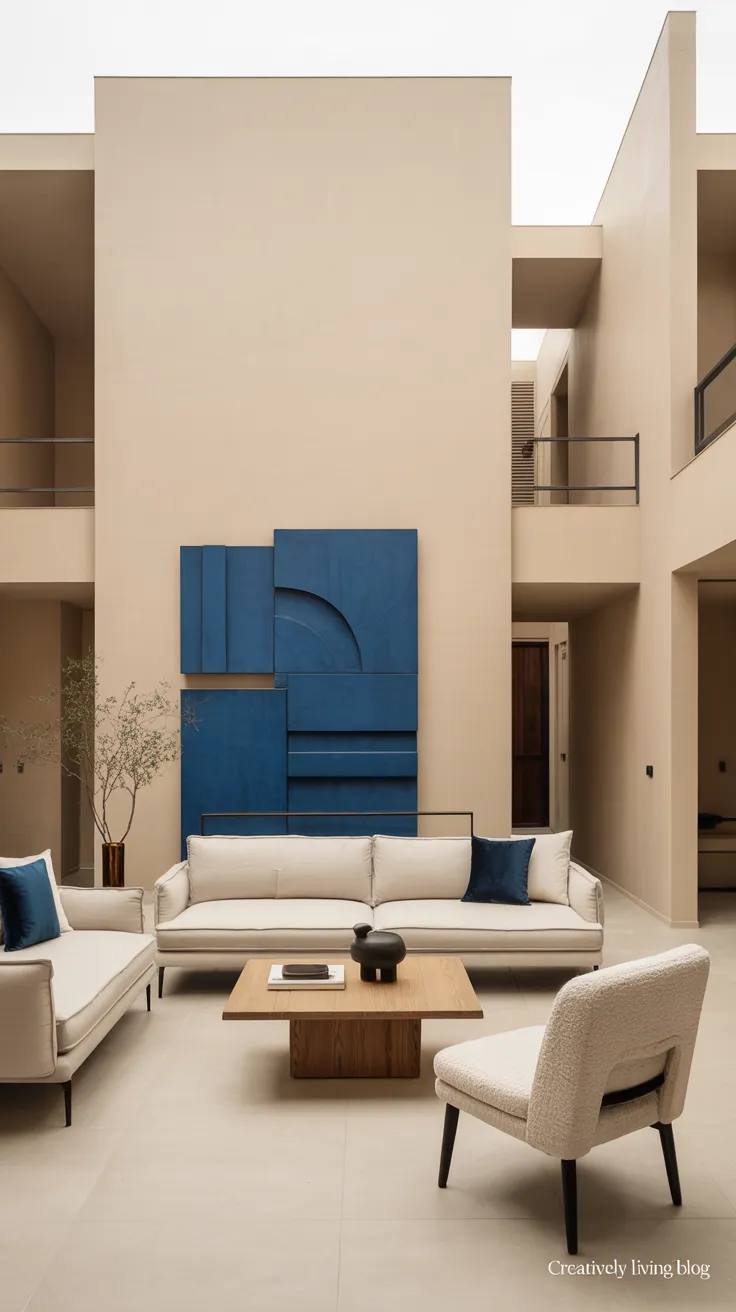 Beige walls, a low-profile cream sofa, one oversized blue abstract painting, and maybe black accents for structure.
