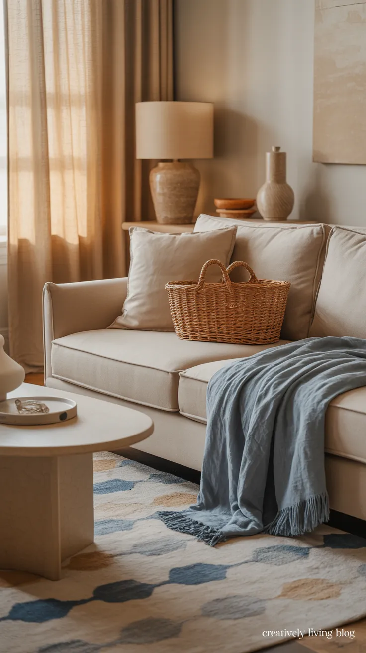 A beige sofa, blue throw blanket, woven basket, linen curtains, warm wood, textured rug, ceramic lamps, and maybe a coffee table your kids have already bumped into ten times.
