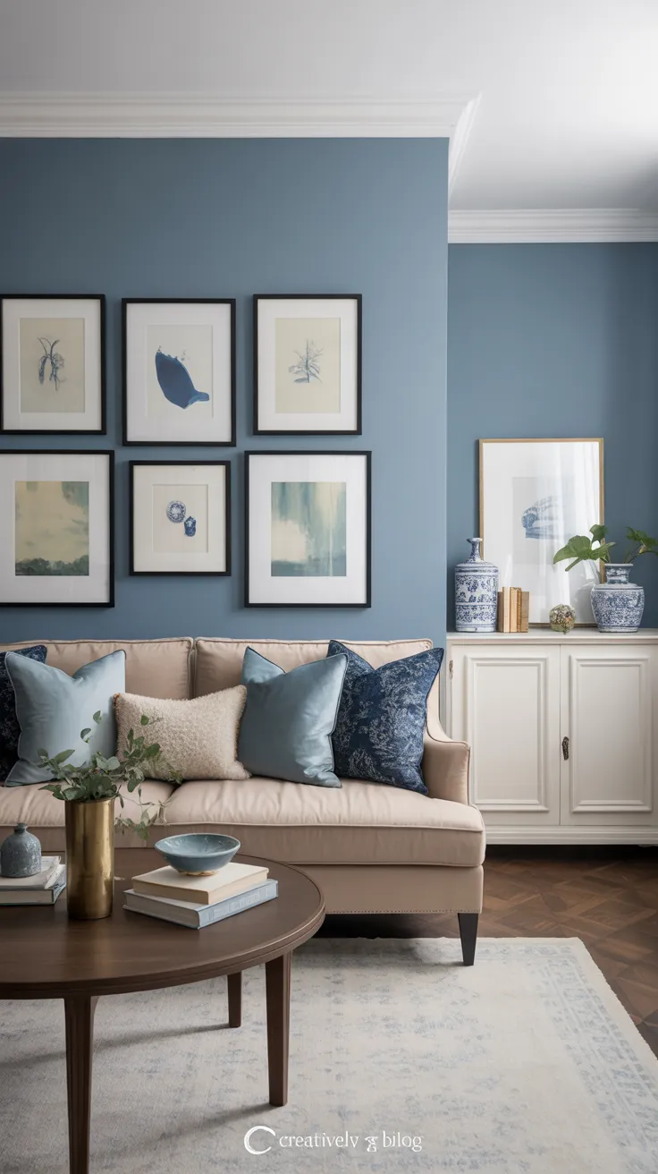 A gallery wall filled with blue-toned landscapes, coastal prints, or abstract artwork can tie the whole palette together beautifully.