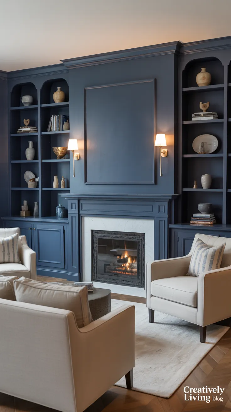 If your living room has built-ins around the fireplace, painting them navy is such a strong move.