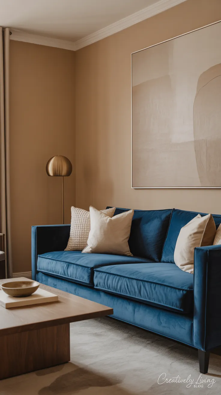 A navy or sapphire velvet sofa adds richness instantly, especially against warm beige walls. It feels dramatic, but still comfortable.