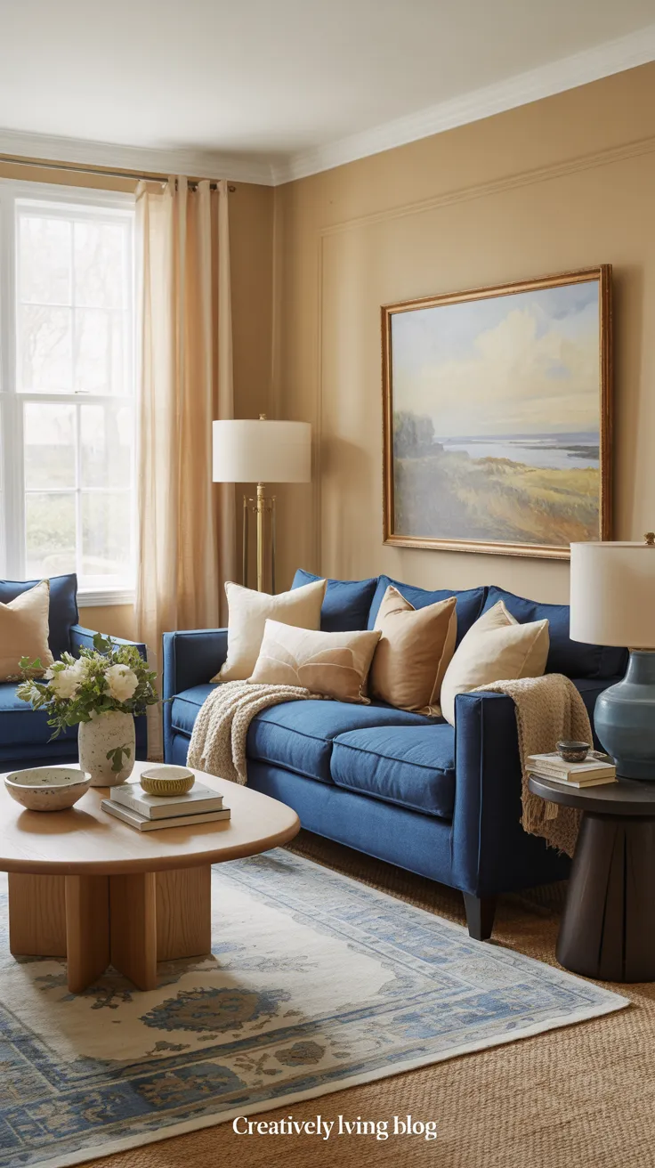 Blue brings calm and depth, while beige keeps everything warm and grounded. It’s one of those color combinations that feels polished without being too formal, and honestly, it works for almost every style—coastal, modern, traditional, farmhouse, or even a cozy family room that has toys hiding under the coffee table.