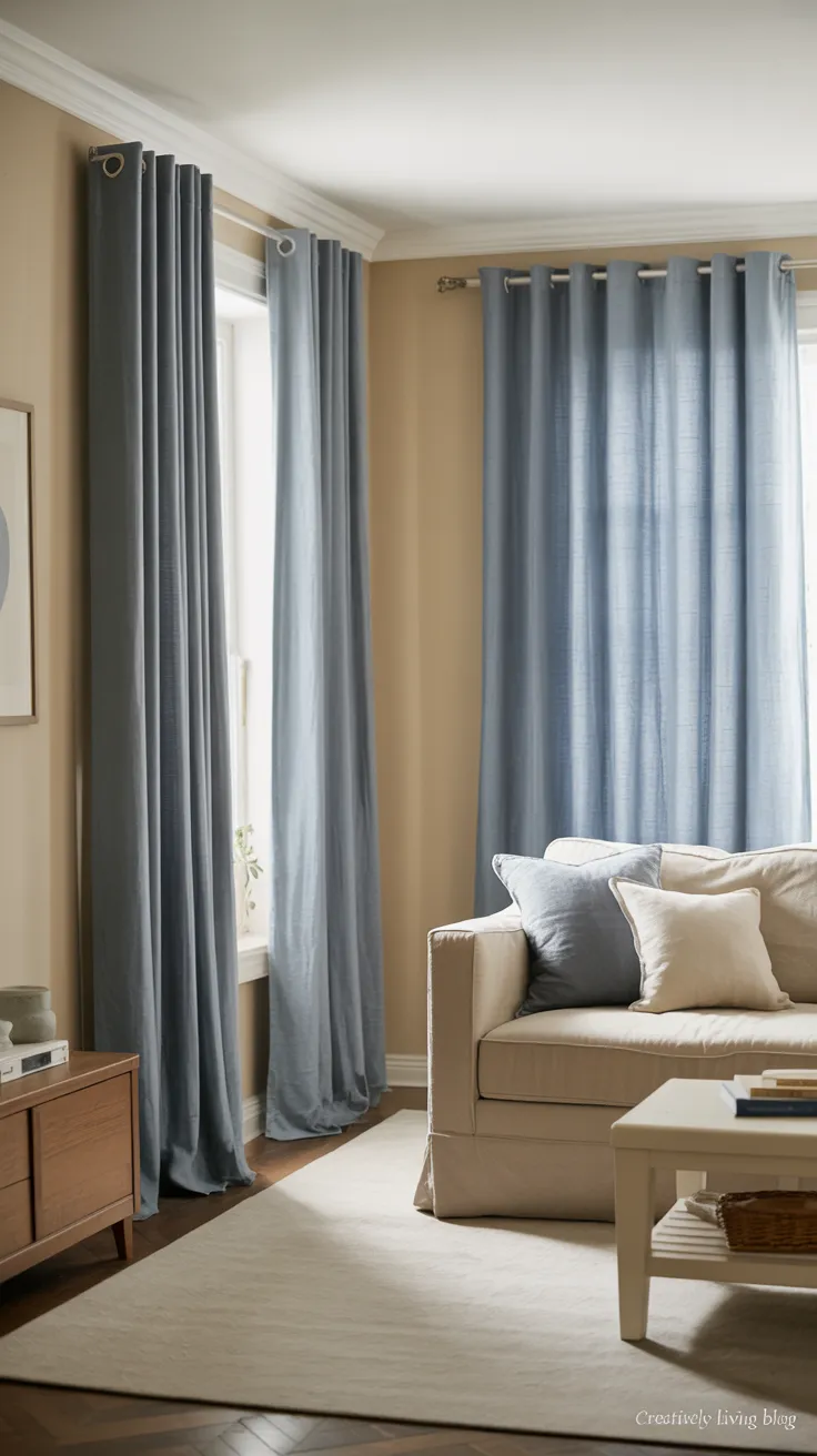 Navy curtains feel dramatic, while dusty blue linen panels feel softer and more casual. I love using blue linen curtains because they make the whole room feel lighter and more finished.
