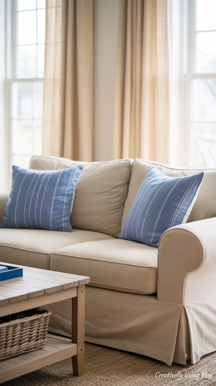 13. Beige Slipcovered Sofa With Blue Striped Pillows