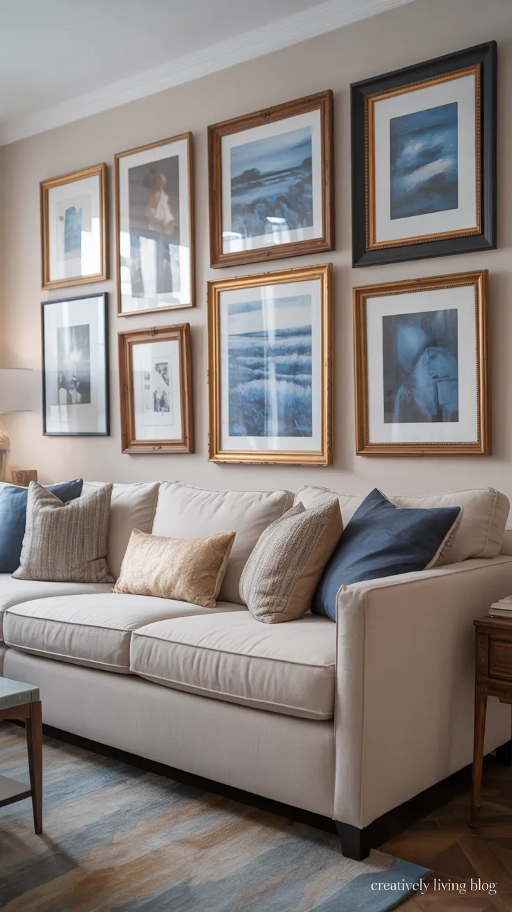 15. Blue Art Gallery Wall Over a Beige Sofa