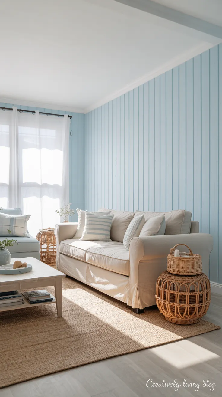 Think pale blue walls, sandy beige upholstery, woven baskets, white trim, and lots of natural light. It feels fresh without looking overly themed.