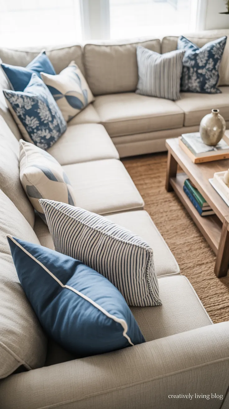 If you already have a beige sectional, layering blue patterned pillows can completely change the space. Stripes, florals, soft block prints, and faded geometric patterns all work beautifully.