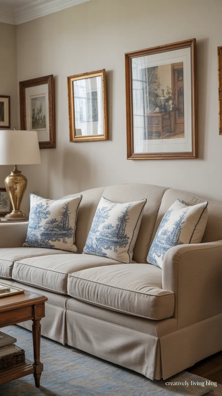 Use a beige sofa as the base, then layer in blue-and-white patterned pillows, traditional artwork, or even an upholstered accent chair.