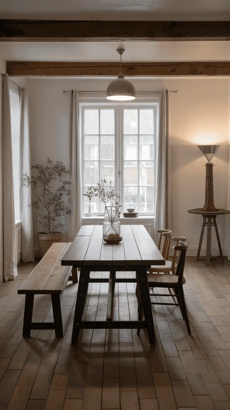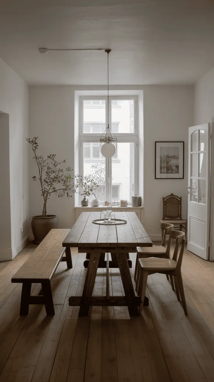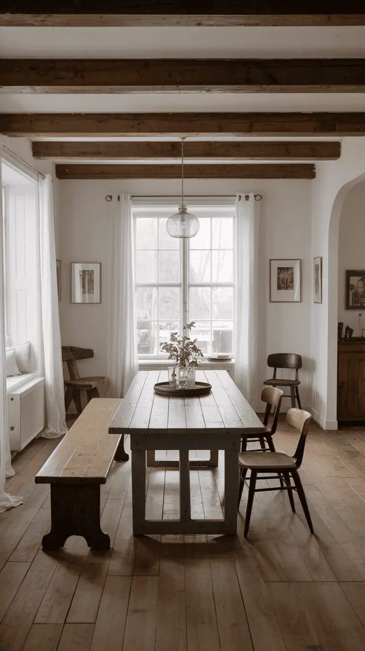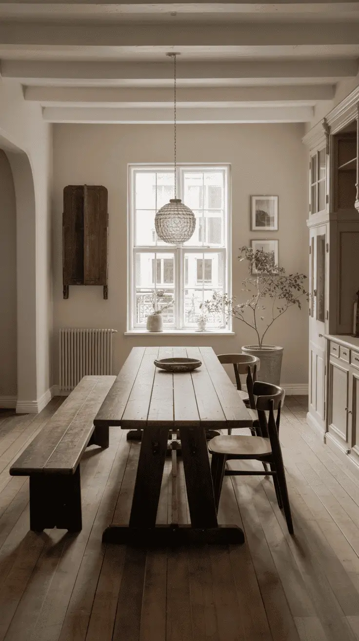 This sort of dining table with bench and chair works well in a classic interior. From the white walls to wood flooring, everything here is extremely cohesive.