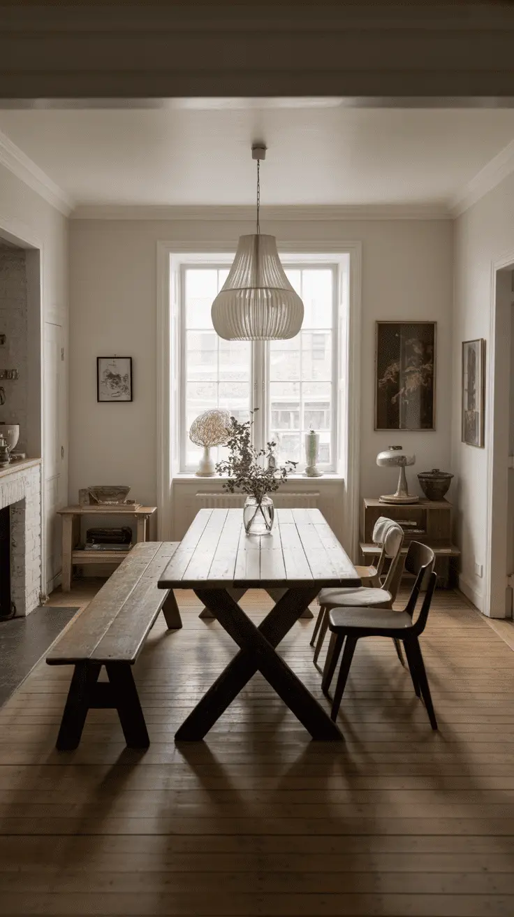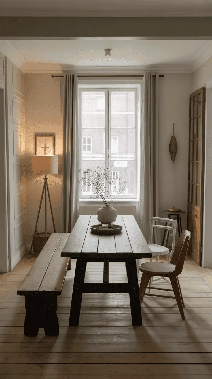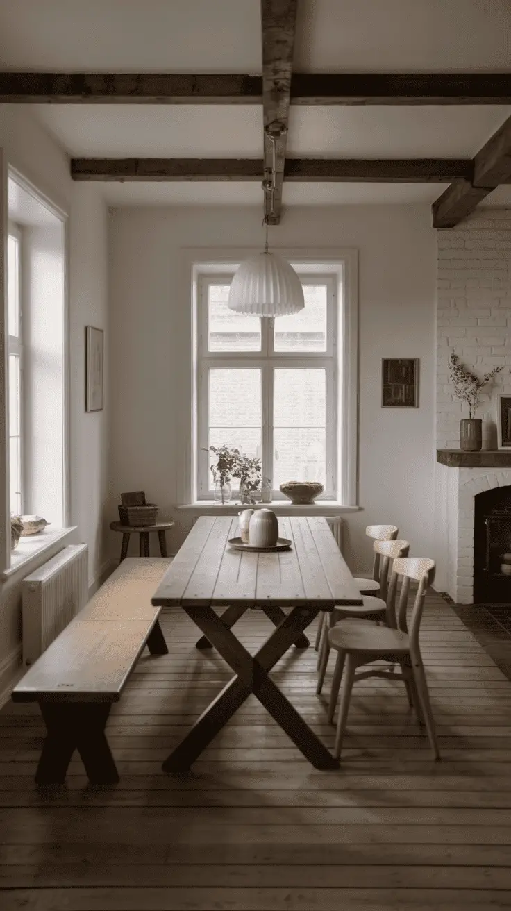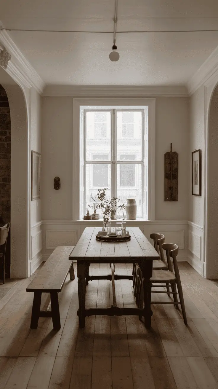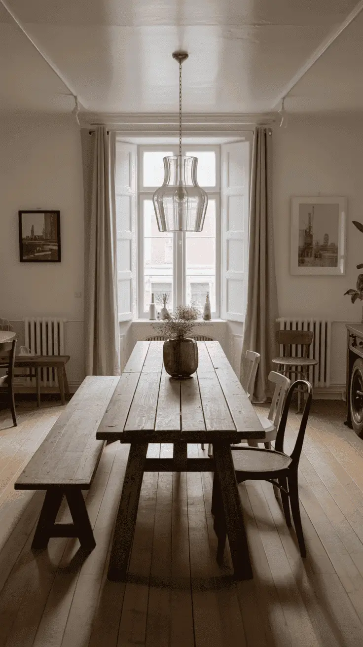 This sort of dining table with bench and chair works well in a classic interior. From the white walls to wood flooring, everything here is extremely cohesive.