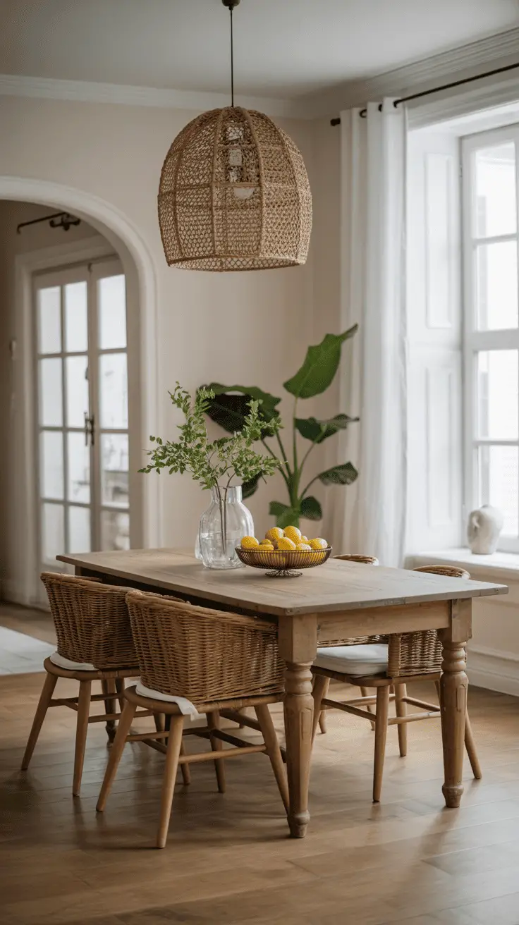 The main highlight is definitely the white tufted bench with wooden legs, which we think is the epitome of modern farmhouse style. Then, there are the more classic rattan chairs and simple, modern white chairs. Each of them enhances the overall look in its own way!