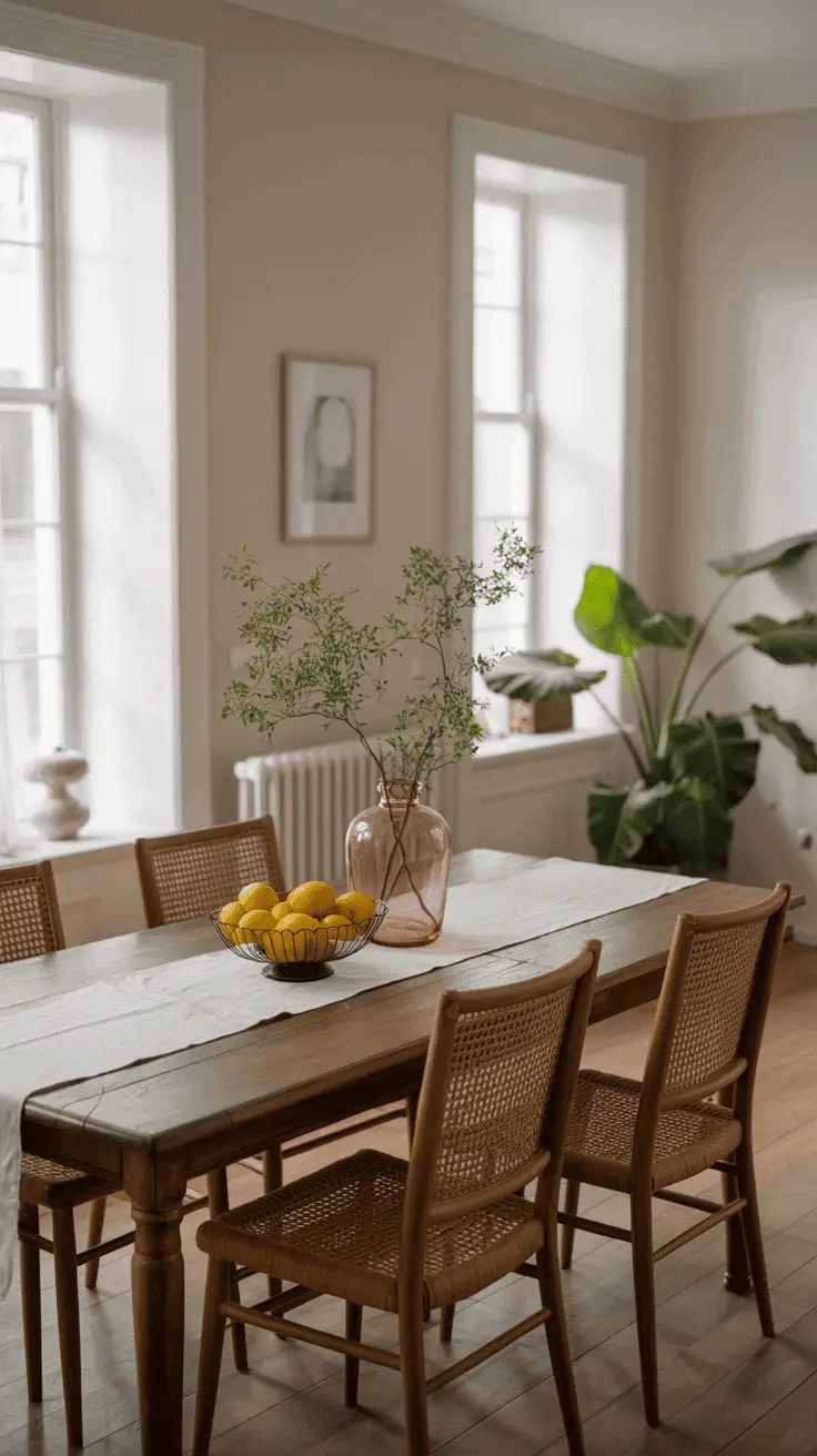 22. Decorate Farmhouse Table with Wooden Chairs and Greeneries