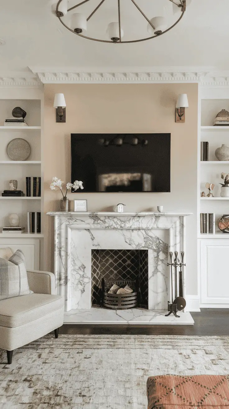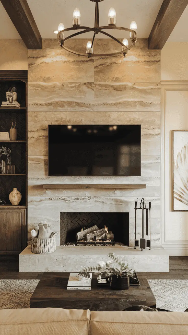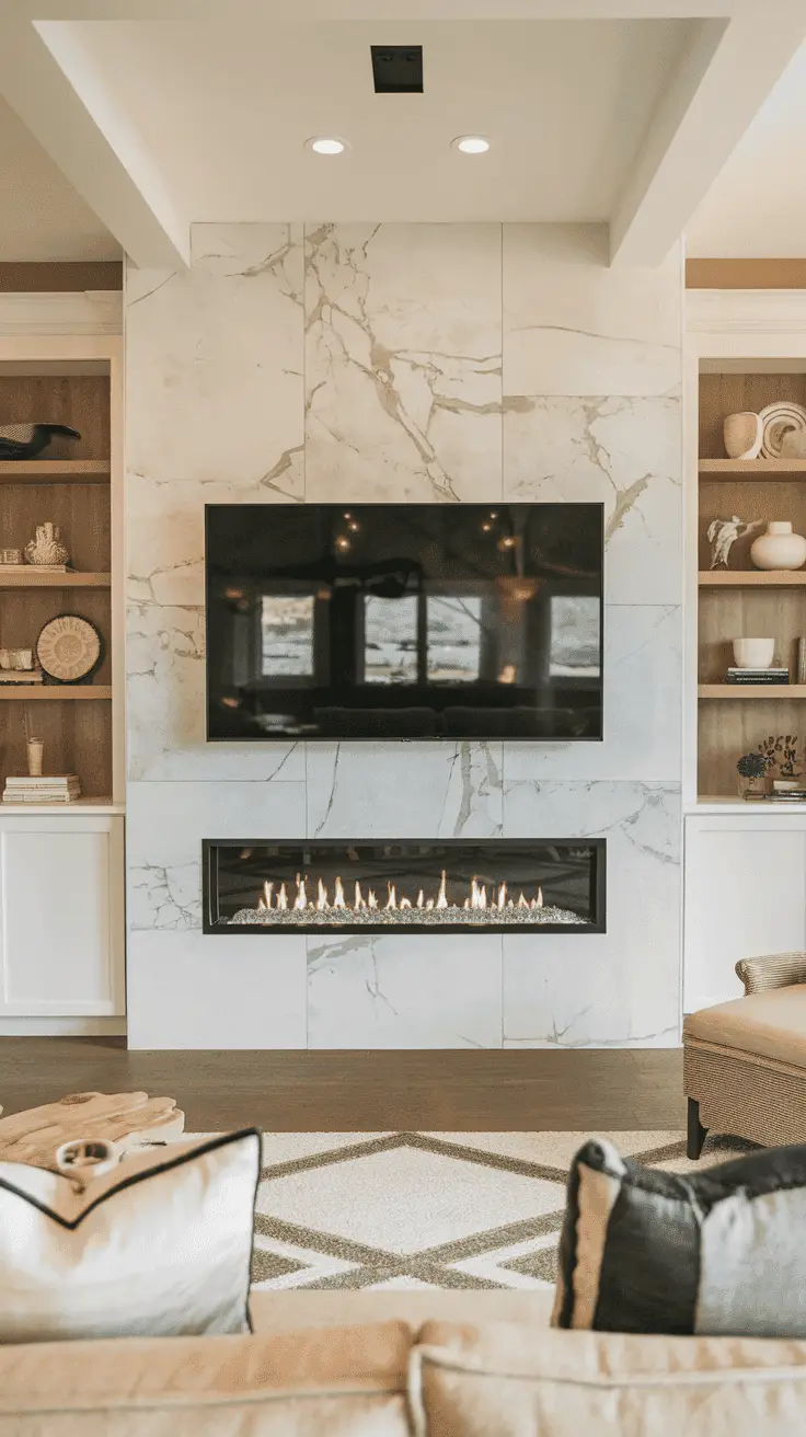 18. Marble-like Tile Fireplace TV Wall