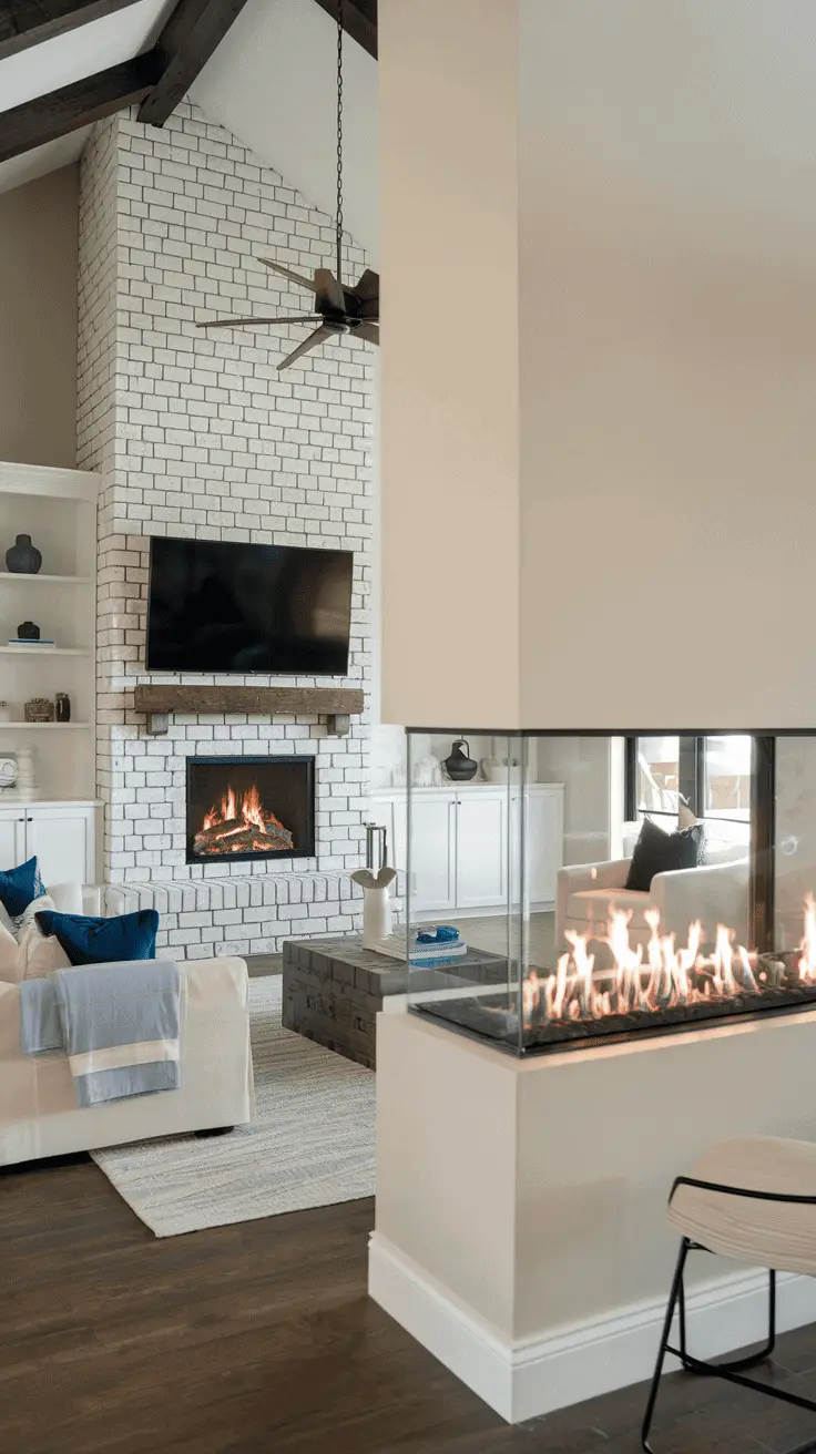 You don’t always have to go for the traditional fireplace wall design. You can transform your home’s interior into a beautiful mysterious layout with a divider fireplace wall. Layer the divider wall with stone or tiles and place the electric/gas fireplace at the bottom center to make it the visual focal point. A concrete slab atop the fireplace supports TV accessories while the empty space allows for easy TV mounting.