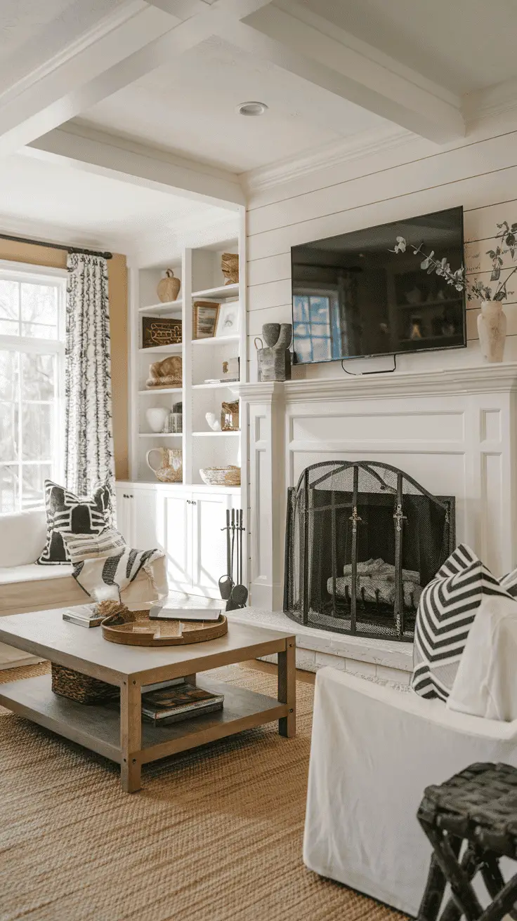 Create a cozy yet elegant coastal-style lounge with a mounted TV, built-in electric fireplace, and side seating. You can use concrete or tiles for a clean, modern look.