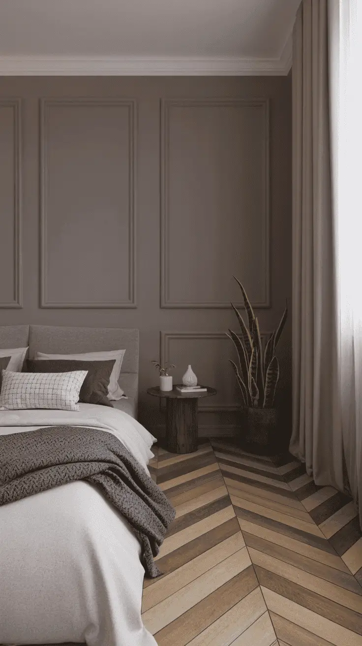 Contrasting with a gray wall, this caramel brown wood flooring brings warmth and comfort like in this room. The equally warm hue of this gray brown wall makes it look minimalist and easy to work with.