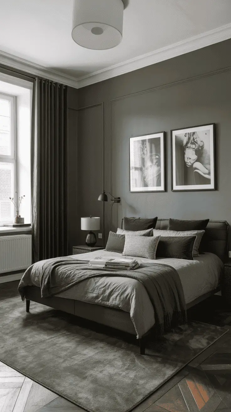 When we think of gray walls, our first thought is paint. However, we can also achieve an appearance with wallpaper or tiles. The herringbone layout adds some texture and movement to keep the dark feature from reading straight.