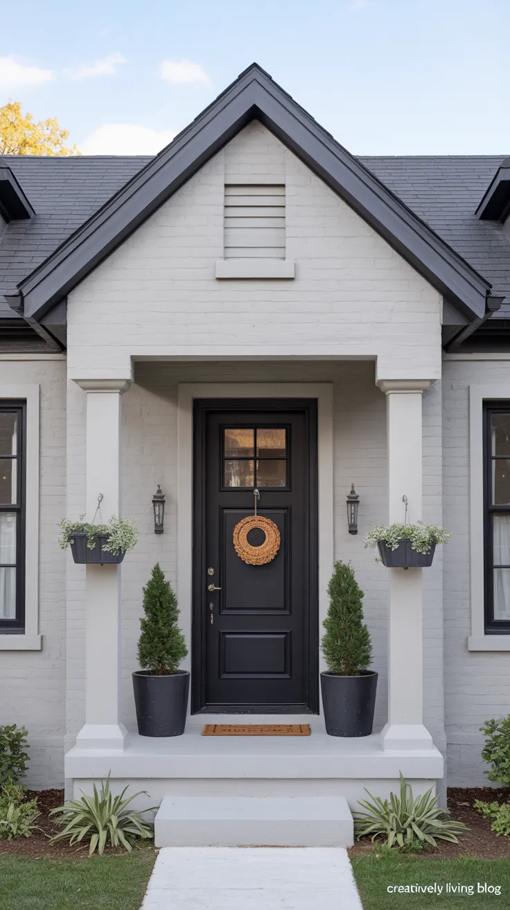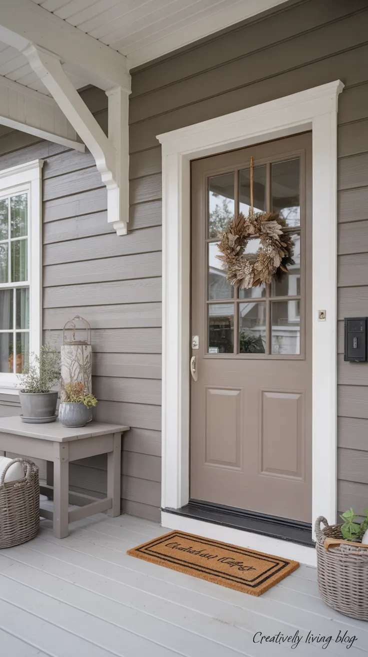 When painting your front door, you are probably thinking about a pop of color. But, using a monochromatic scheme and going with another shade of gray for your front door can be a good choice. Using a grey front door with a grey house is a good idea when you have a lot of color elsewhere, like in your plants, shutters, trim colors, etc. Also, a monochromatic paint scheme with gray on gray is a great paint scheme for a minimalistic look.