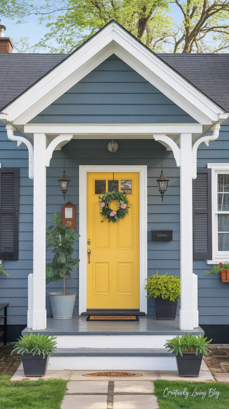 Sherwin Williams, decisive yellow, was one of the colors named most welcoming front door color of the year. Choosing decisive yellow for your gray house should be an easy decision. Gray and yellow are the perfect coordinating colors for a home. Try adding in pops of dark blue either on your shutters or trim color for a timeless, yet modern home.