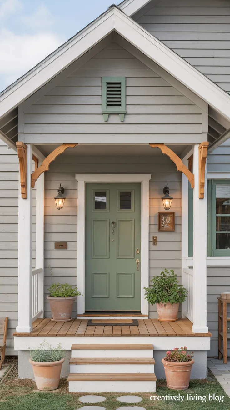 A gray house mixed with the color Quite Coral by Sherwin Williams is the best way to make a statement. It is no surprise coral is a popular color on gray houses. It is the perfect mix of feminine on a neutral gray house.