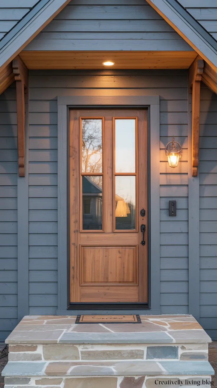 Neutral gray homes paired with a dark stained wood door is a breathtaking look. Impress your neighbors by updating your front door with a new wood door and staining it a beautiful dark tone. When shopping for stain colors, consider using the color Dark Walnut. This well-known dark stain is a designer’s favorite pick for a stained front door with a gray house.