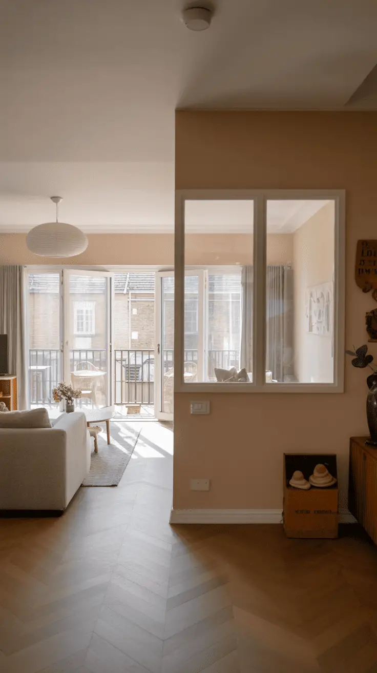 You can create more spacious spaces by reflecting the natural lights coming from the outside to other rooms. As can be seen in the picture, the light beams coming from the outside are reflected towards the hall. The window is fixed because there is a transition and what we really want here are the light transitions.
