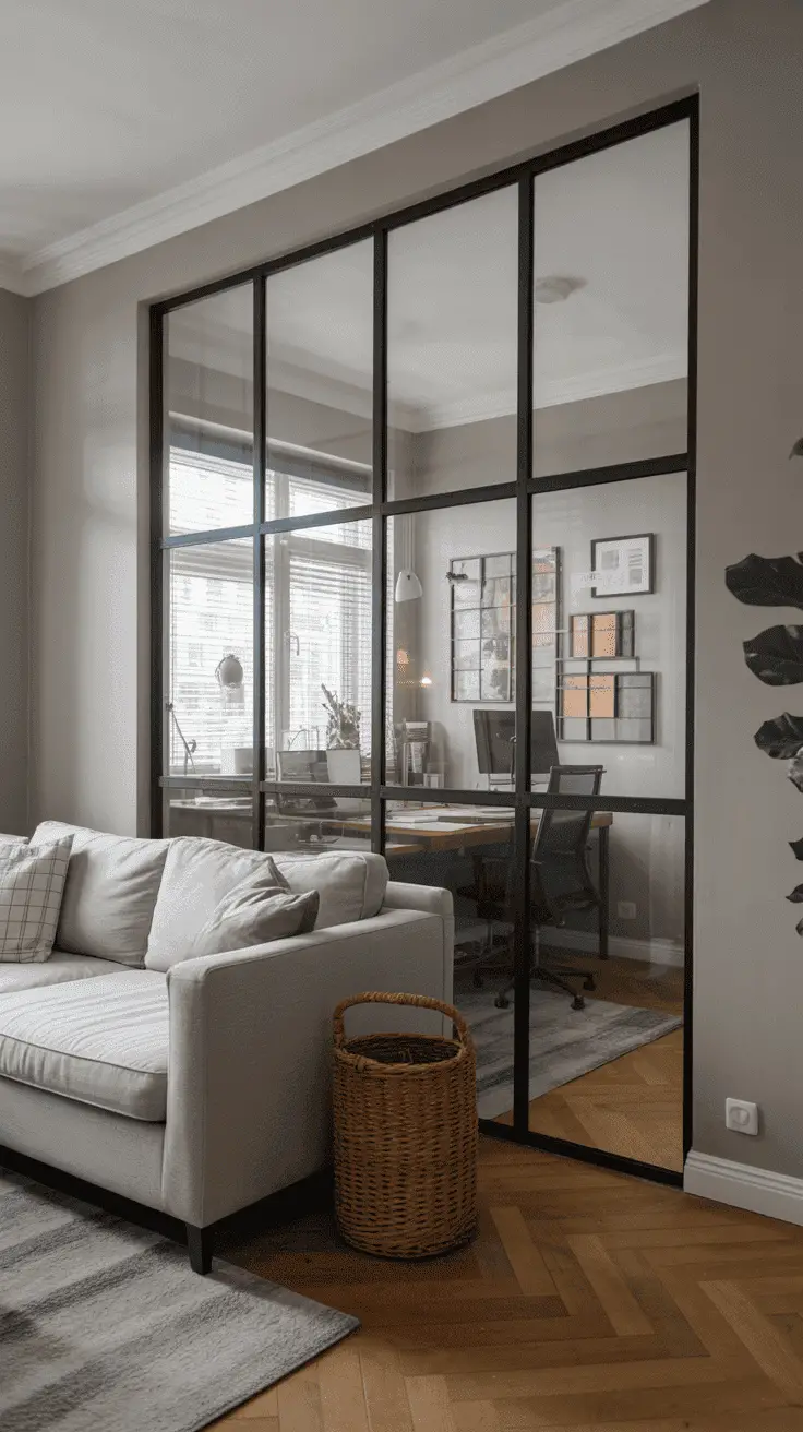 Not a window but a glazed door that performs the same function, it helps maintain a sense of flow between different spaces. This home office benefits from additional light leaking through the glass in the doors, but the room can still be sealed for better sound and heat insulation. Also, it separates the main space from a region close to the entrance and prevents someone from outside suddenly entering the main space.
