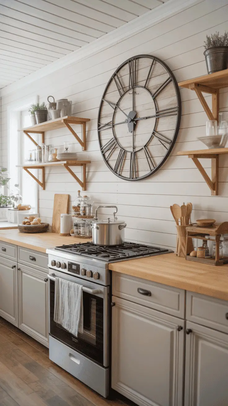 Mount a large wall clock to a large bare kitchen wall for a sublet finish.
