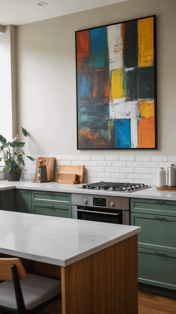 If you have an extensively empty kitchen wall, you can instantly fill it up with a clean oversized art piece. This kitchen wall décor idea works great for different themes, even minimalist kitchens. You just have to pick the right art piece for your space.