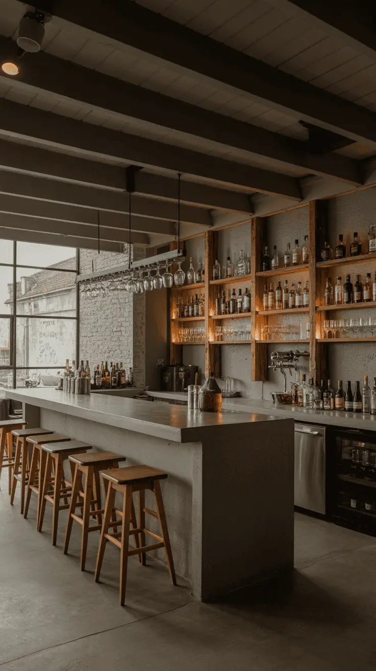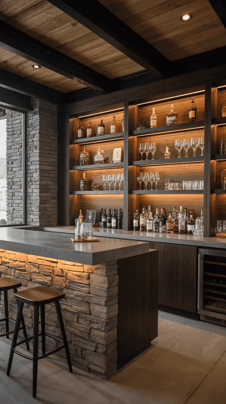 In this example, you can also try mixing rustic ideas with more modern touches too, such as a concrete bar table with dark wood platforms. It is a more contemporary approach to the rustic style.
